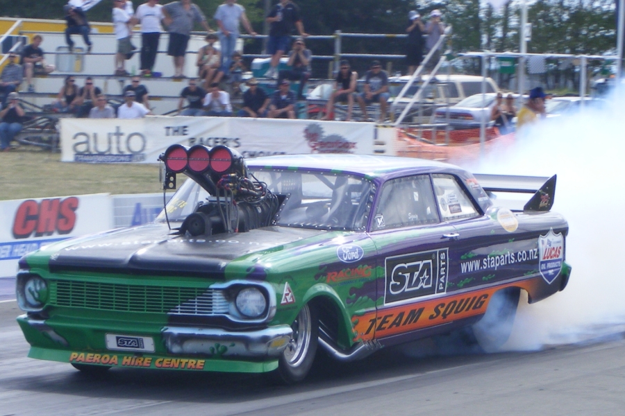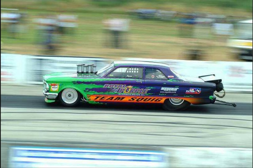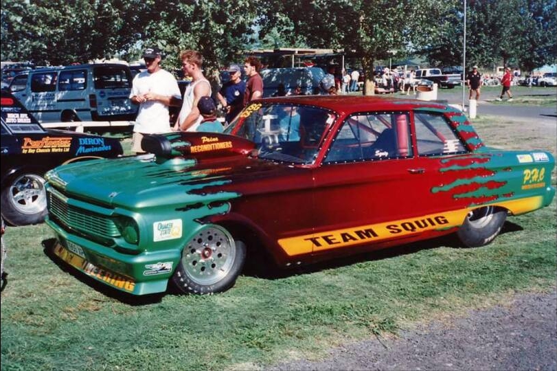Squig started drag racing in 1990 with his current car, a 1965 XP Falcon. Originally a four door with a six cylinder motor, the car has gradually been modified and upgraded to what it is today. Squig won Top Doorslammer at the Dragmasters meeting last season. He has previously won the Super Gas pointscore series and held both of the NZDRA B/TS records for two years.